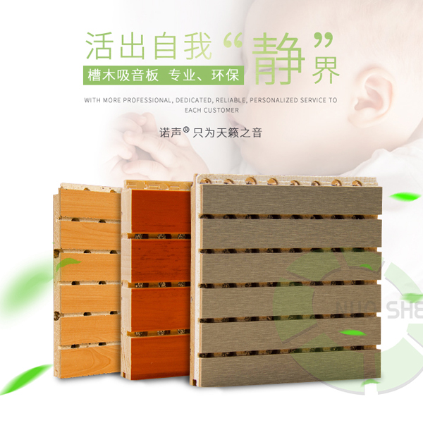 諾聲槽木吸音板是一種在高密度板的基礎上,板面開槽板背穿孔達到狹縫共振的優質吸聲材料。是一種理想的吸聲裝飾材料。具有吸音、環保、阻燃、隔熱、保溫、防潮、防霉變、易除塵、易切割、可拼花、施工簡便、穩定性好、抗沖擊能力好、獨立性好、性價比高等優點,有豐富多種的顏色可供選擇,可滿足不同風格和層次的吸音裝飾需求。